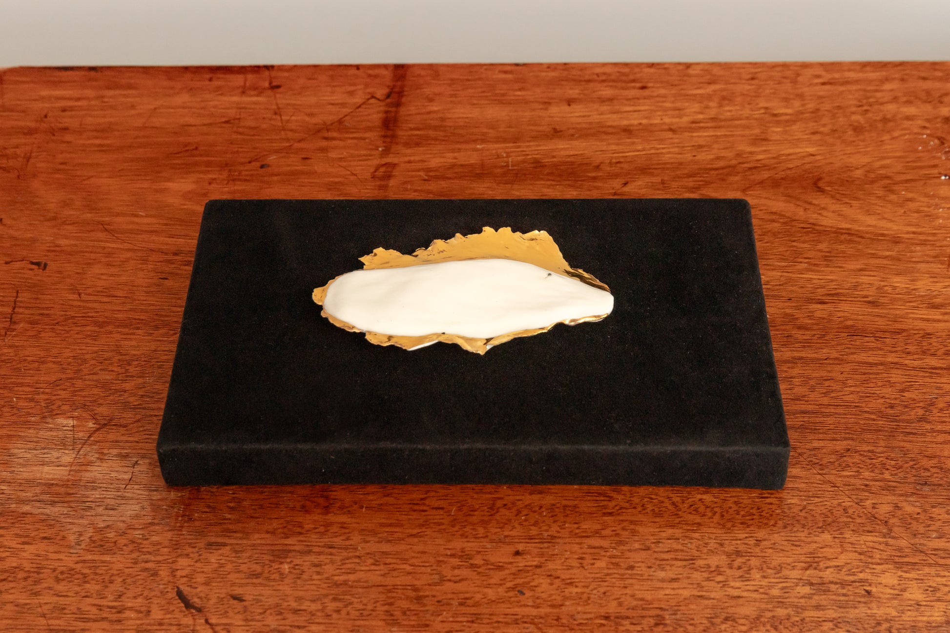A moment in time is a gold-lustred porcelain mango seed that acts as a memento vivere. Standing in counterpoint to the traditional memento mori, it is an ode to life, an invitation to remember to rejoice in the abundance of life.