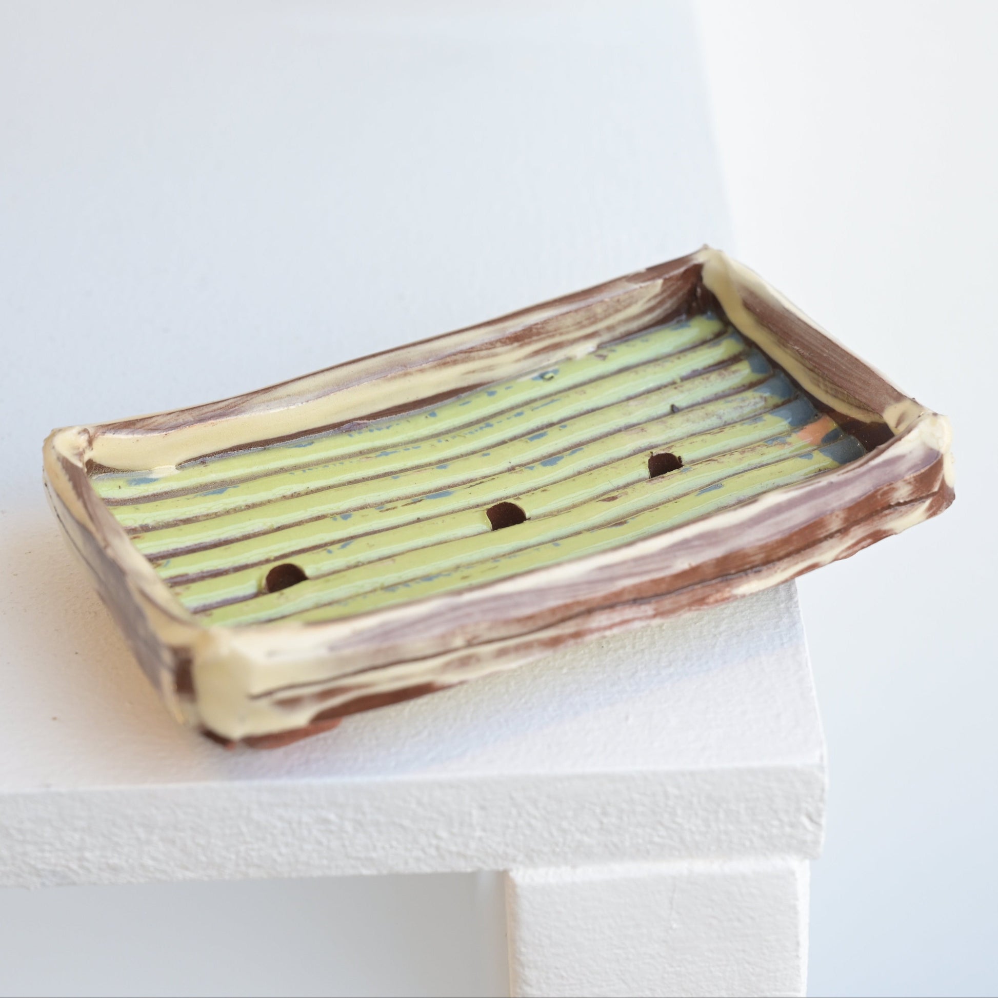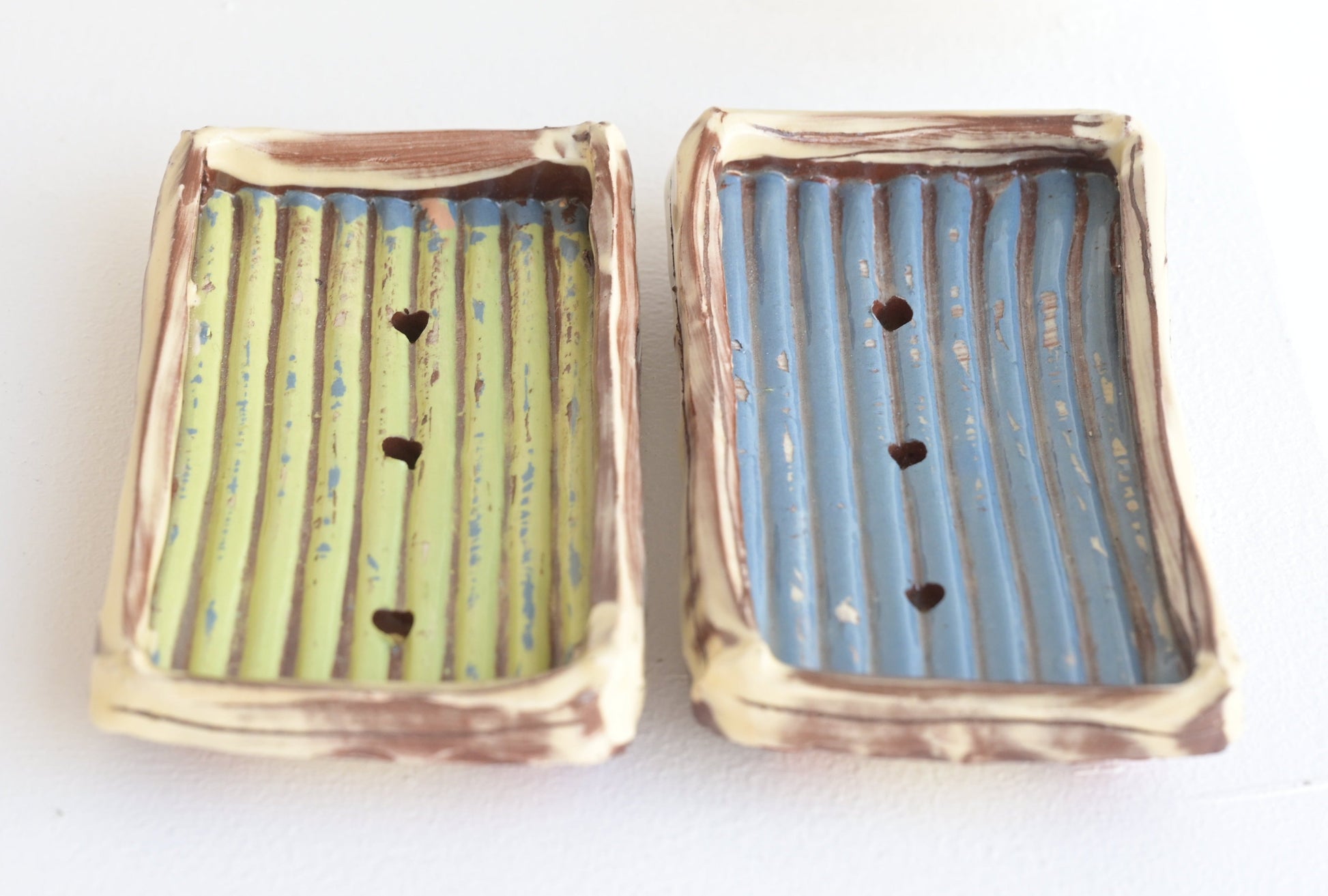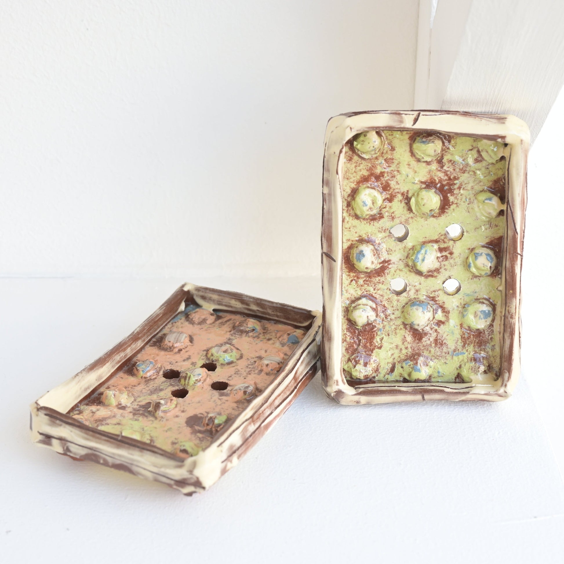 Soap dishes made from terracotta and coloured slip, cast from found materials.