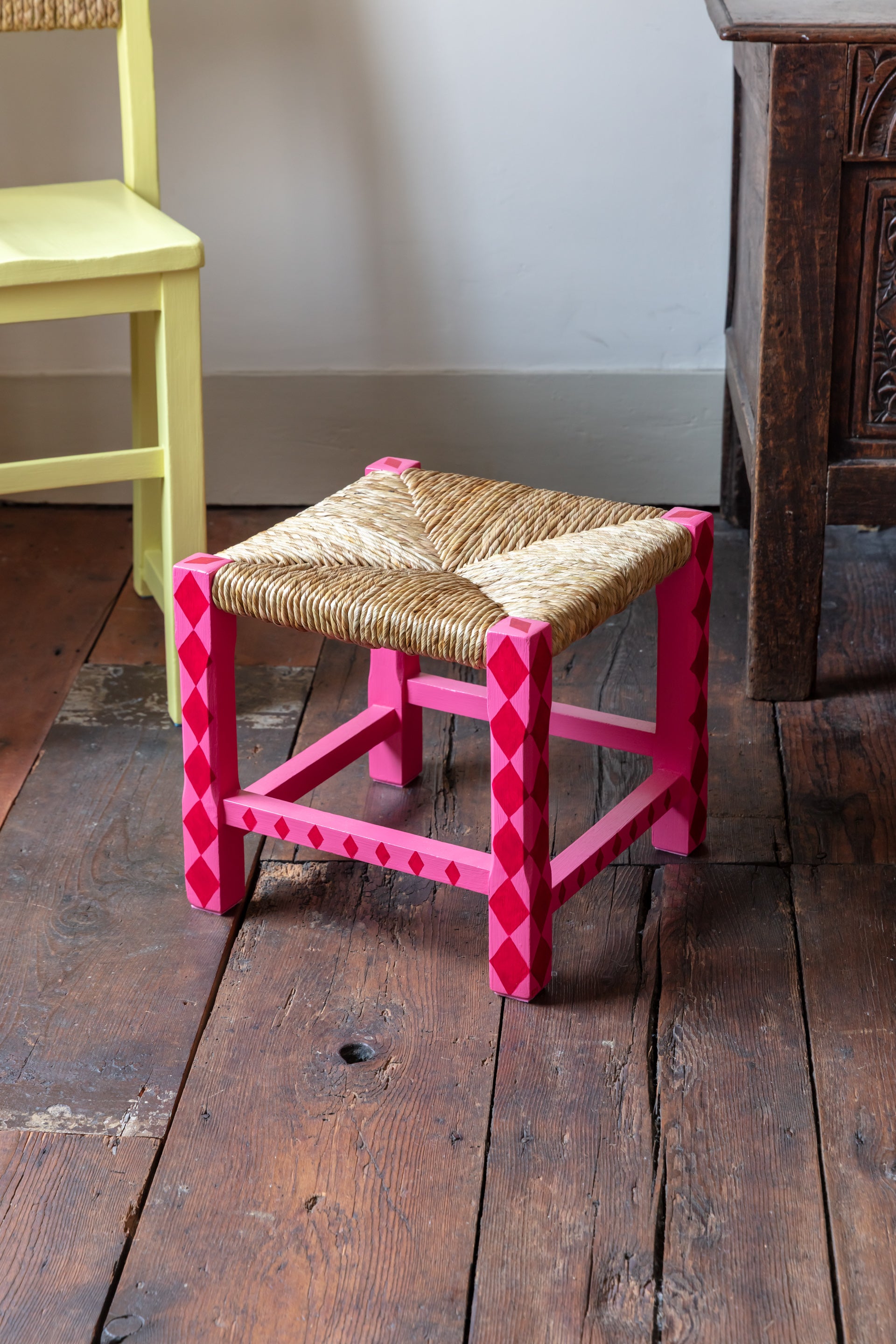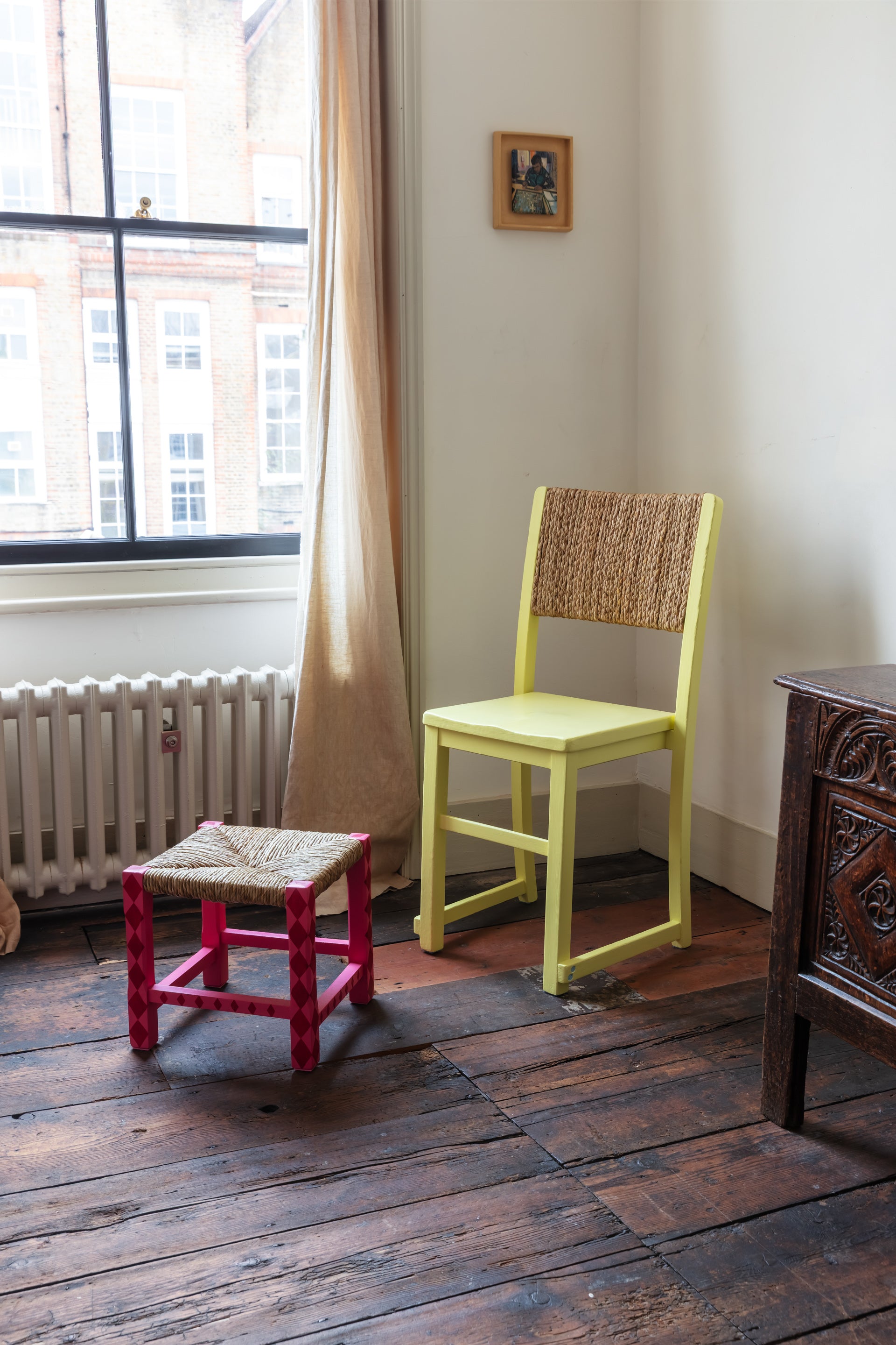 Ella Merriman reclaimed an abandoned stool using joyful colour and the ancient craft of rush seating. Discovered on Blackstock Road in North London, the piece was restored with rush harvested by hand by the artist in Somerset.