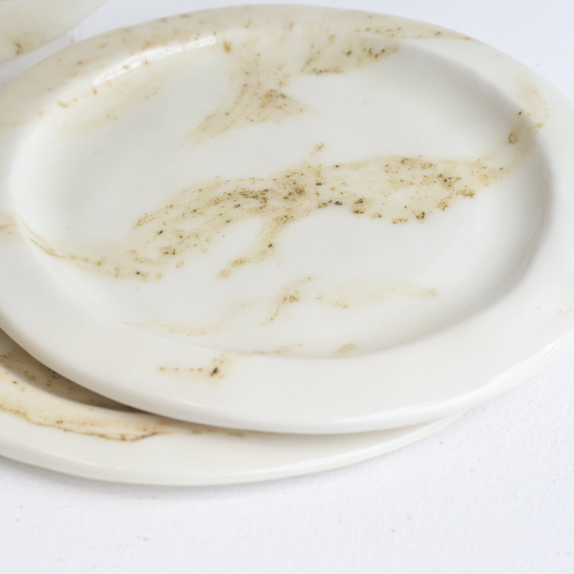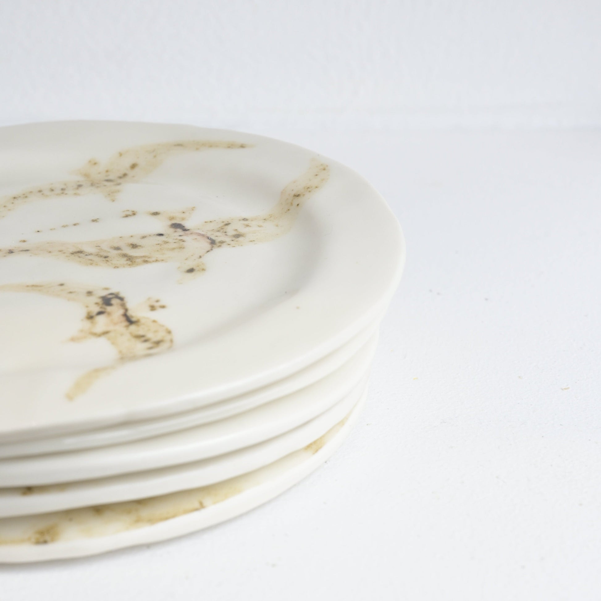 These are food safe, handmade porcelain plates painted with Hampstead Heath iron oxide.