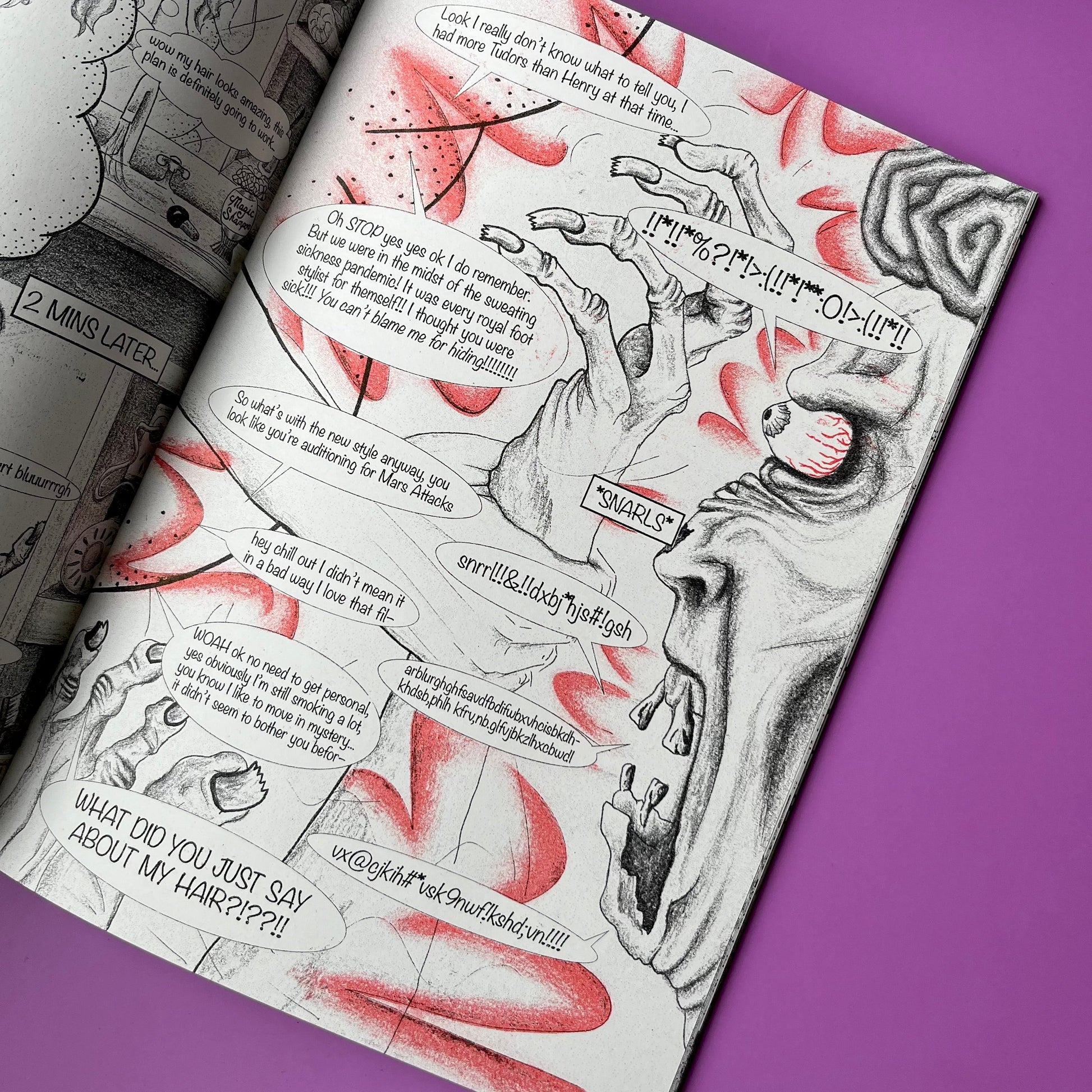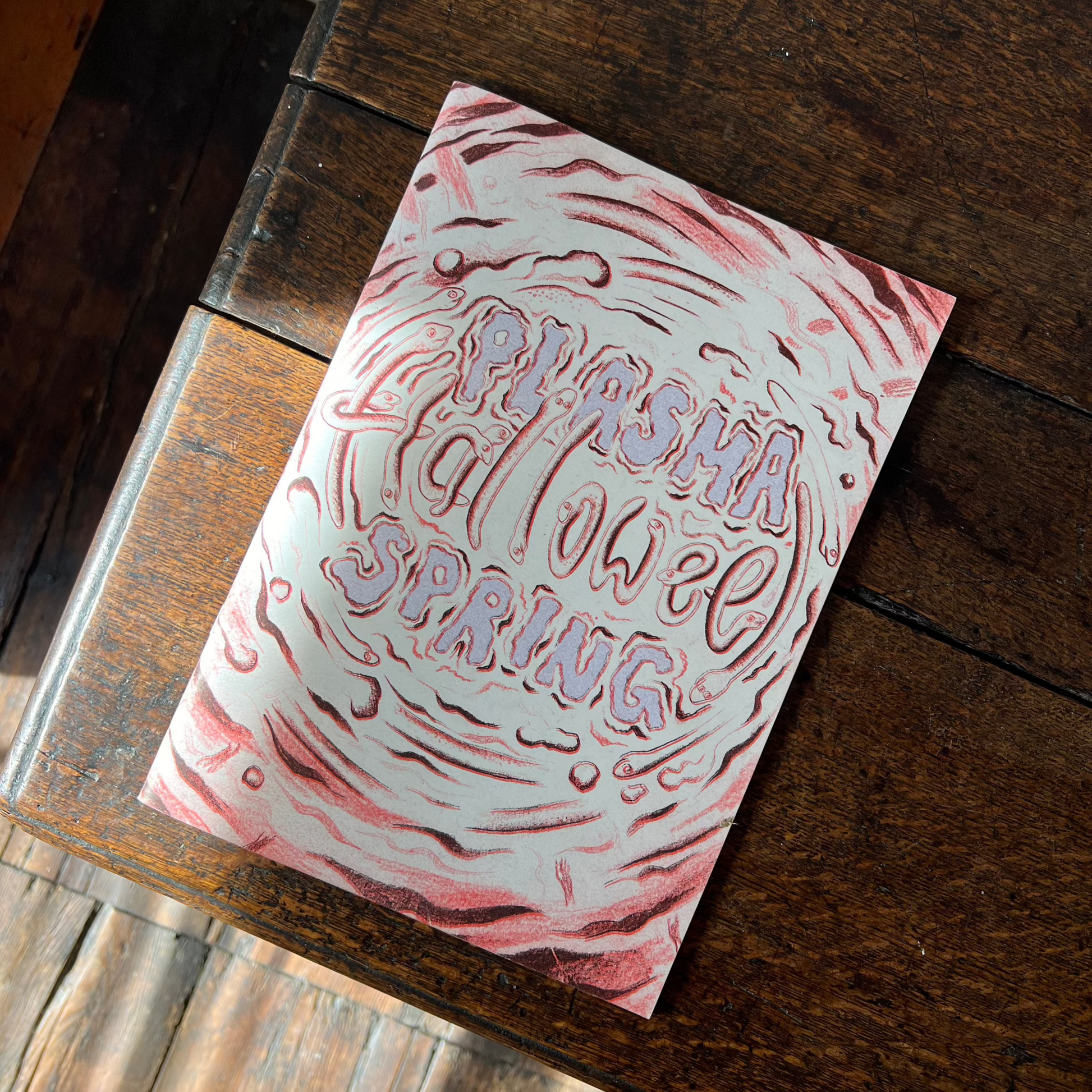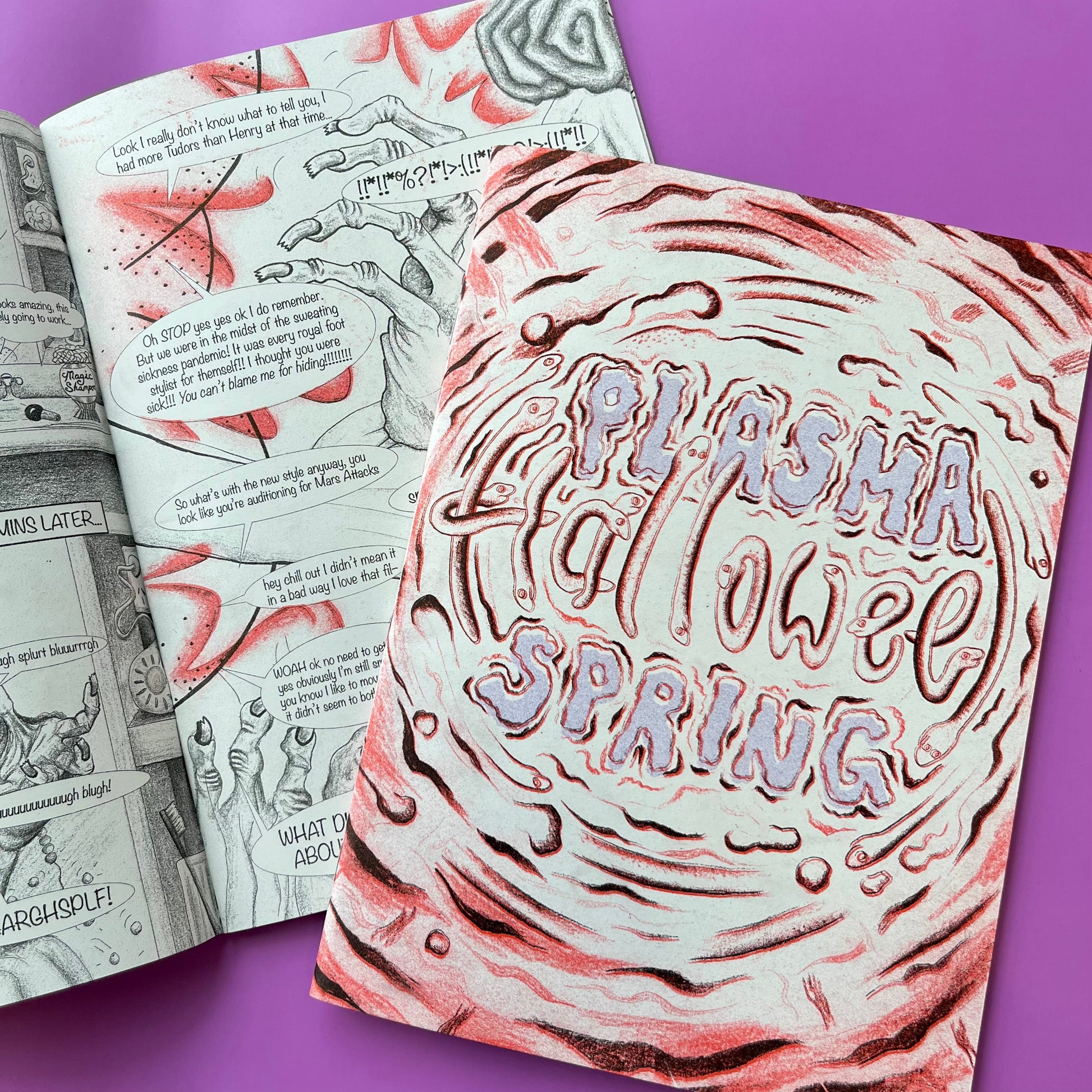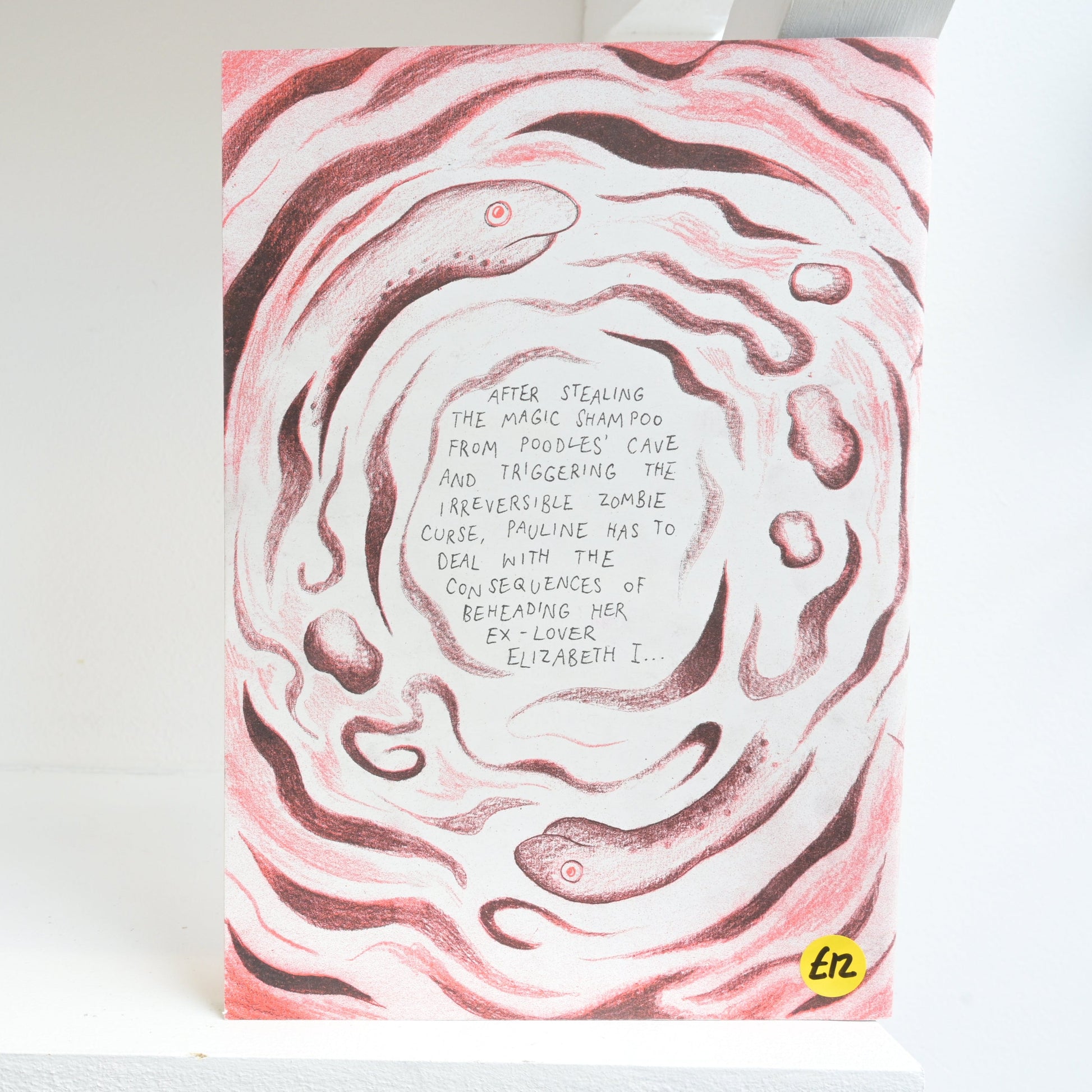 Pauline tries to clean up after beheading her zombified ex-lover Elizabeth 1st, but winds up in a conspiracy involving eel-infested royals, frozen swans and a sapphic vampire commune based in artist Leonor Fini’s Parisian apartment. 'Plasma Spring: Haloweel' is a standalone instalment in a series which also includes ‘Plasma Freeze: Salon at the Centre of the Earth’ (published by PrintRoom Rotterdam in 2021), ‘Plasma Freeze: Making Friends’ (self-published, 2020) and ‘Plasma Spring’ (self-published, 2019).