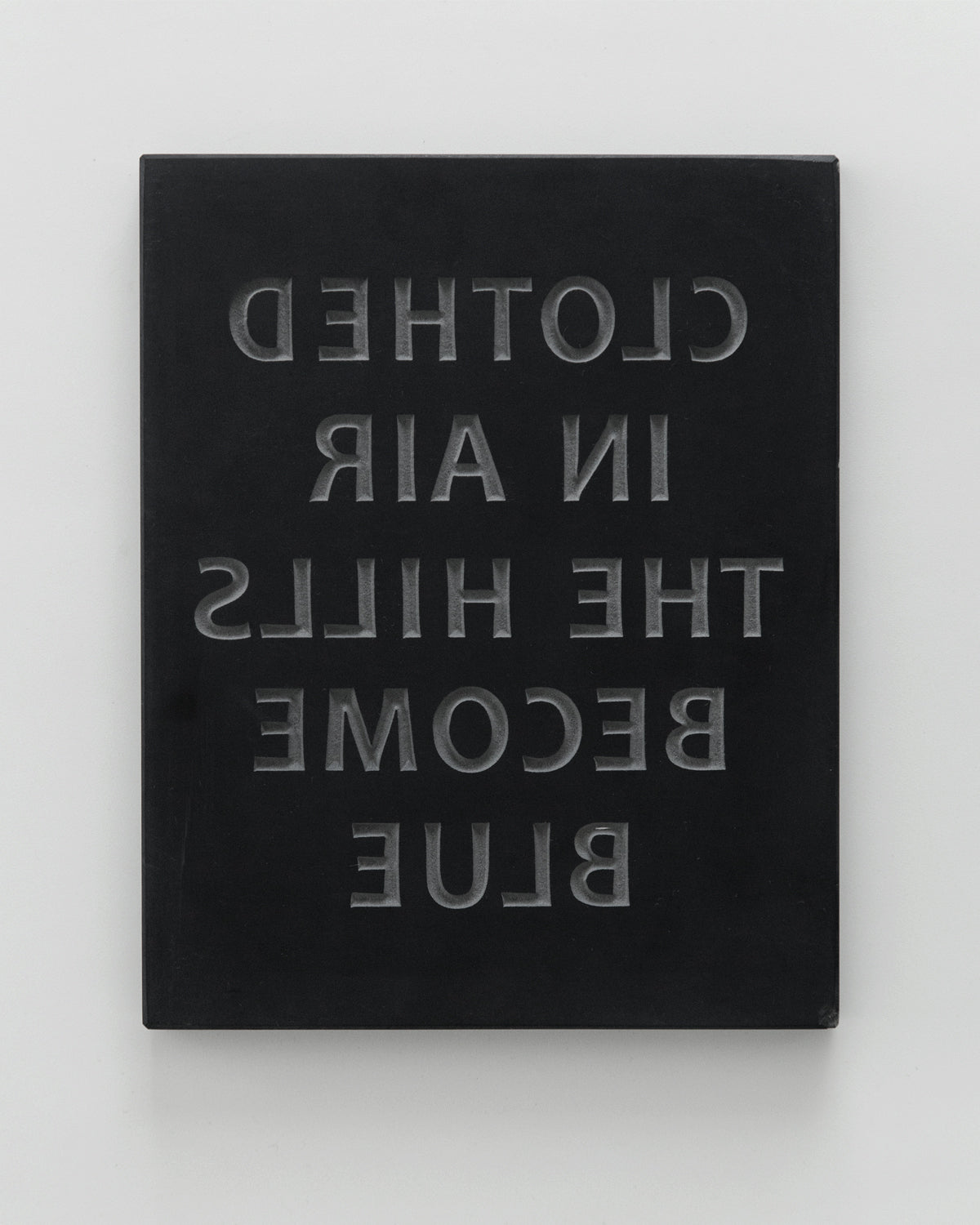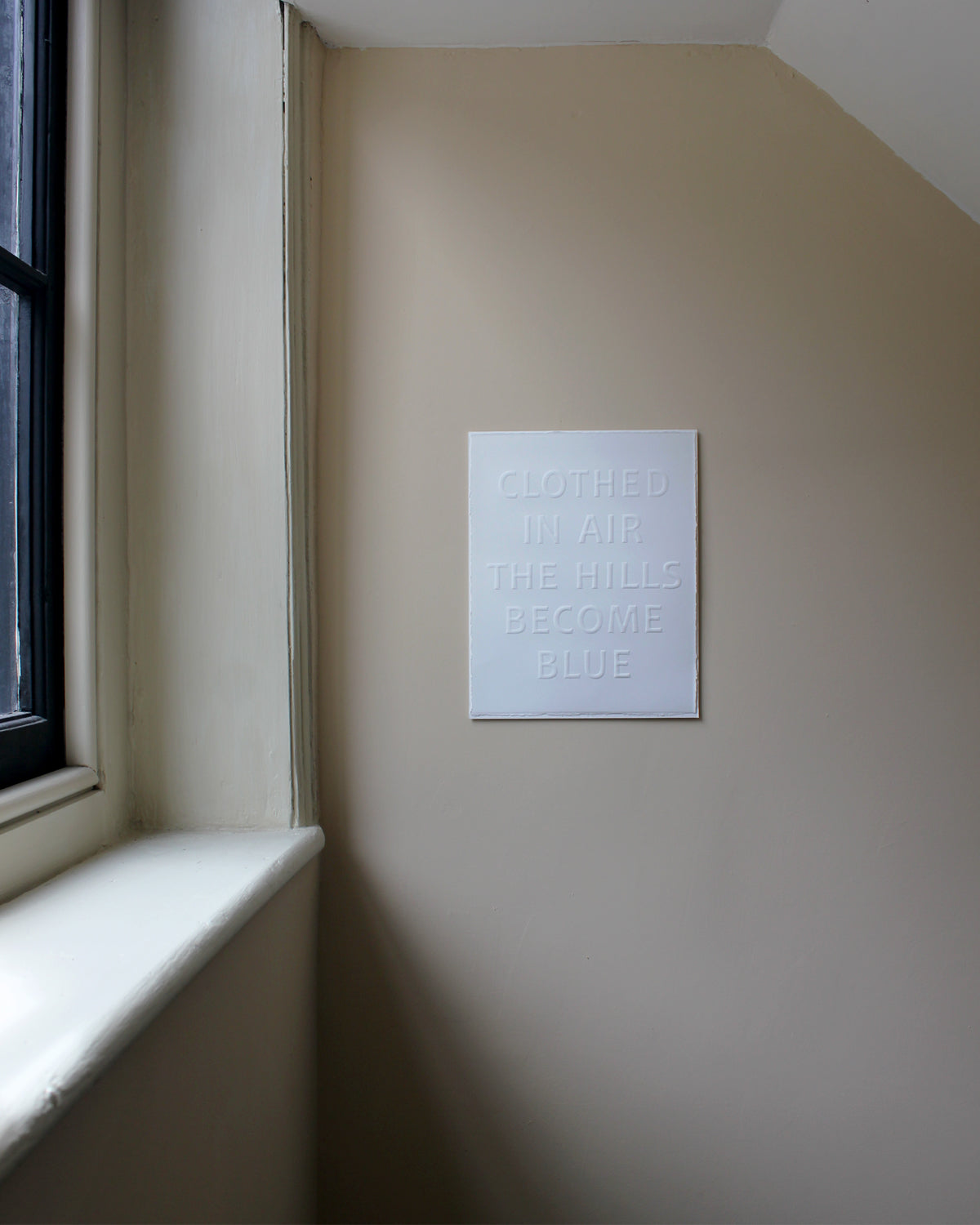Sculptor and stone letter carver Liz Middleton felt a connection between Nan Shepherd's words and Van Gogh's paintings through their shared intense observation of landscape. The embossed lettering activated by raking light is pressed from inscribed blue slate.