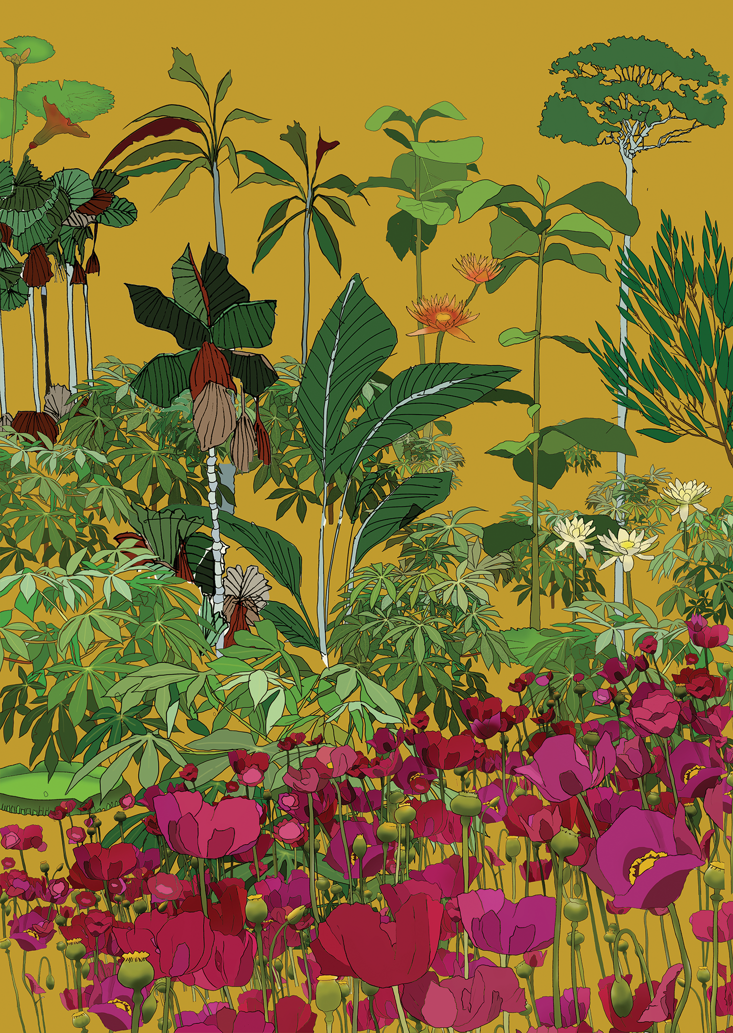 “Looking out of the window” is a fantastical depiction of a “beautiful” view - an assemblage of various plant species crowding together, each taken from the drawing series of the digital publication Feral Atlas: The More-than-Human Anthropocene. Each plant species participates in a series of historical events of ecological catastrophe caused by humans but went out of human control. To know more about the uncontrollable ecological effects caused by human infrastructures, please go to feralatlas.org.”