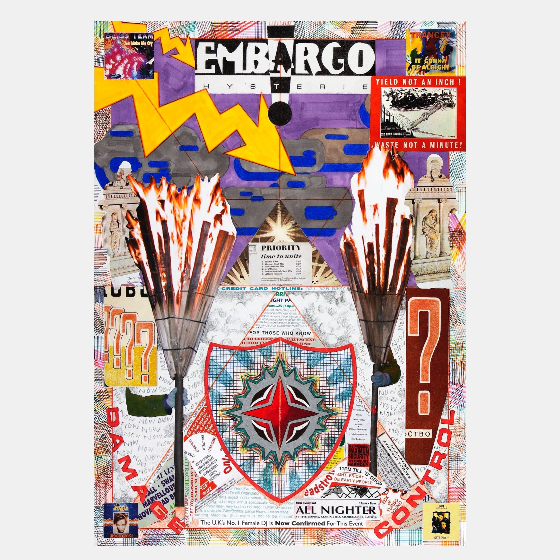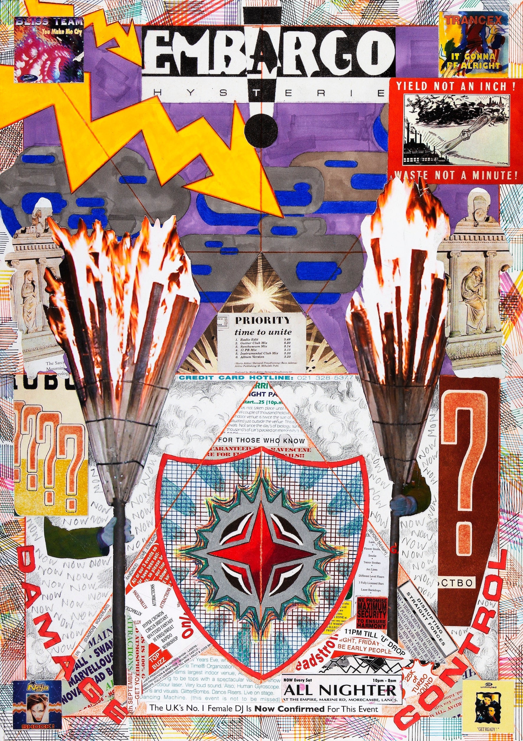 Priority is a fictional club poster consisting of found imagery taken from 90s rave flyers and album art. Inspired by Barbara Stauffacher Solomon’s 36 Plays on a Page — graphic works containing ambiguous performance scripts — Priority likewise prompts its viewer towards uncertain action, exceeding the conventional limits of marketing by issuing wild promises and doom-laden pronouncements about an unknown future event. The work is part of an ongoing series by Rowland Hill exploring 1990s Eurodance music and its portentous, disquieting rhetoric of utopia and disaster.