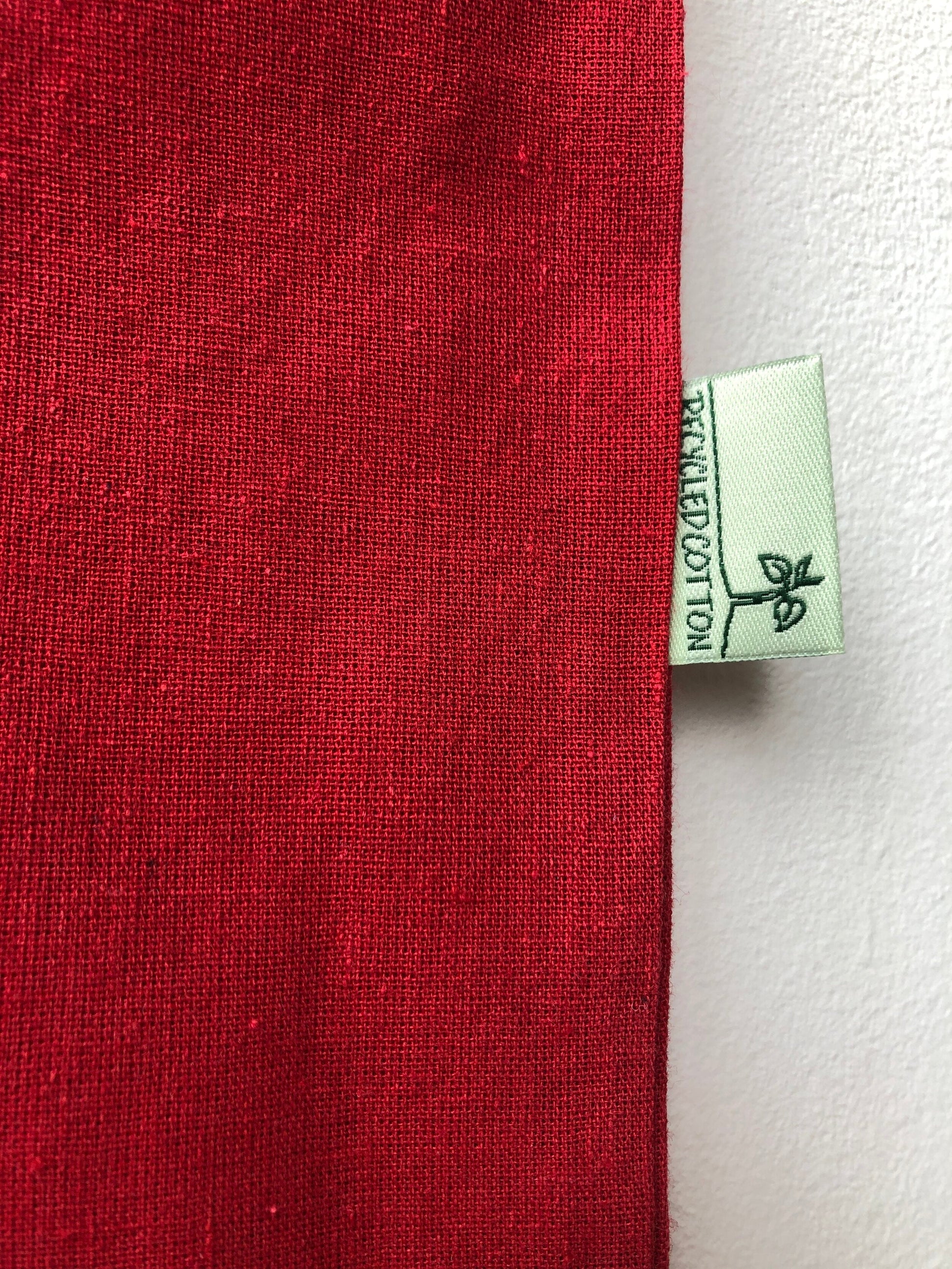 A red recycled cotton screen-printed tote bag featuring the San Mei Gallery logo.
