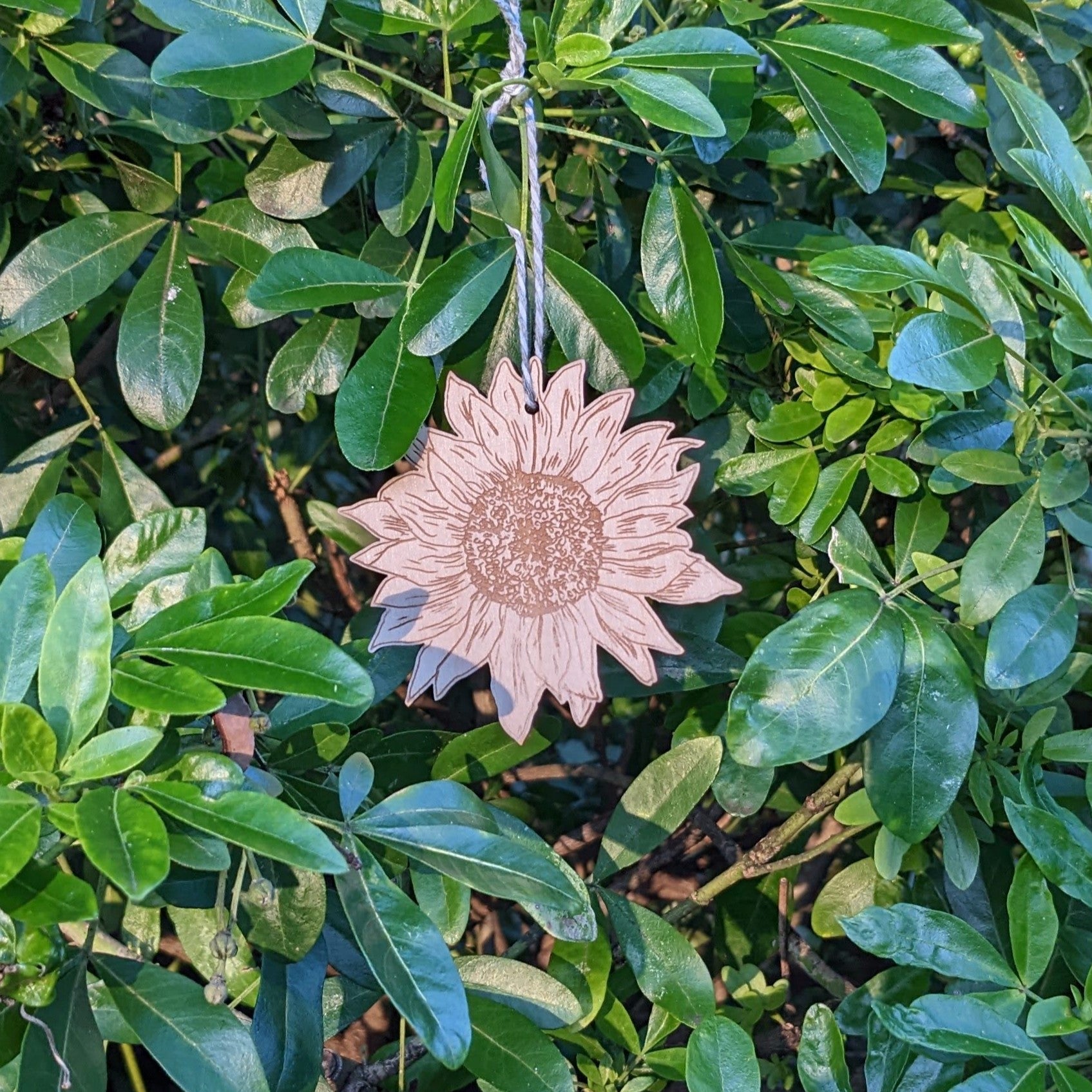 Laser cut sunflower hanging decoration made by the artist Megan Fatherly. Created from an original drawing in collaboration with local Cornwall laser cutting company Cut by Beam. Exclusively made for Van Gogh House as an ode to Van Gogh's sunflowers.