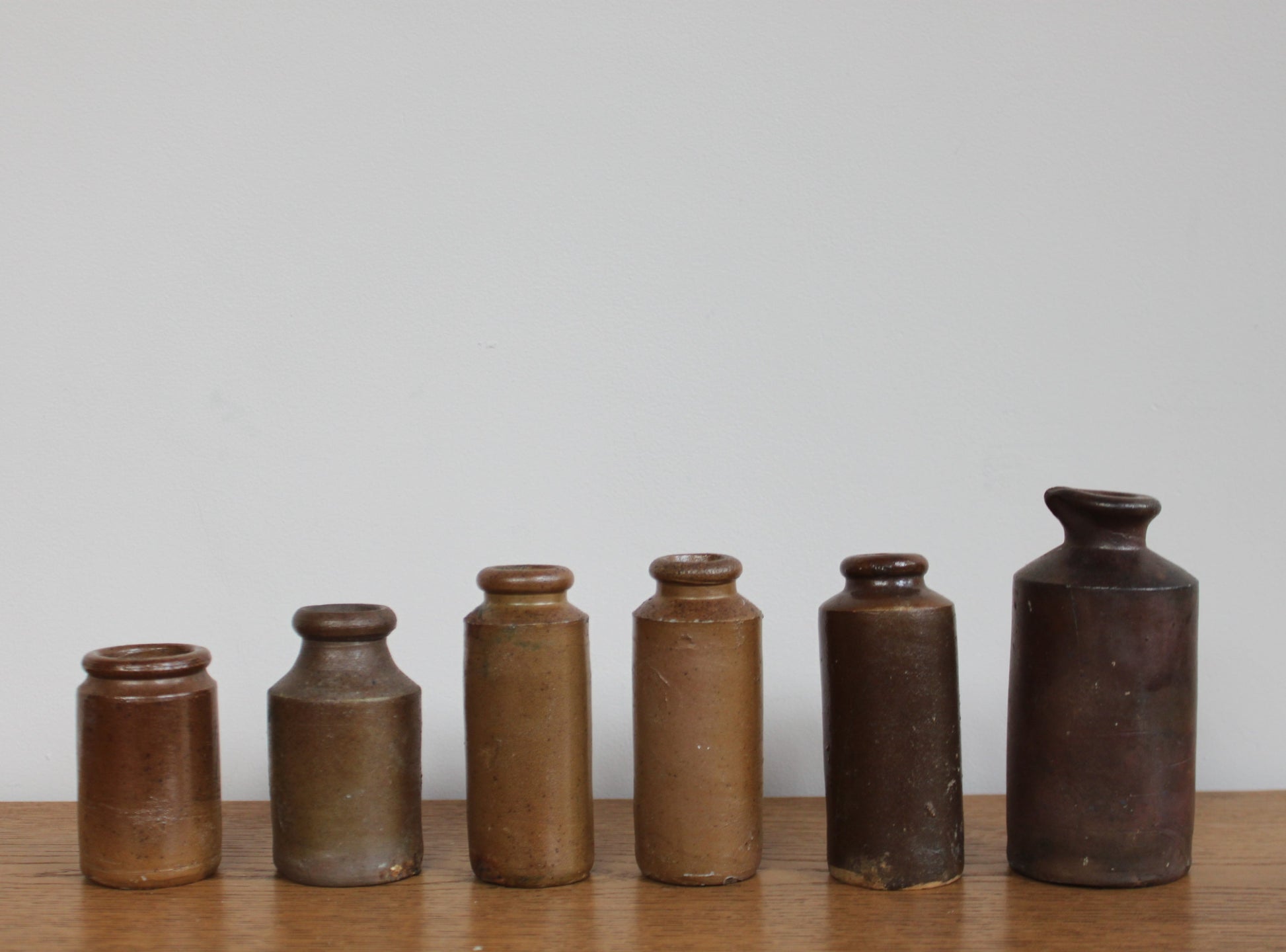 Originally used for storing ink in the 1800s, these ink bottles came with small cork stoppers. The salt glazing means each is unique, some being darker and some lighter and all having different patination.
