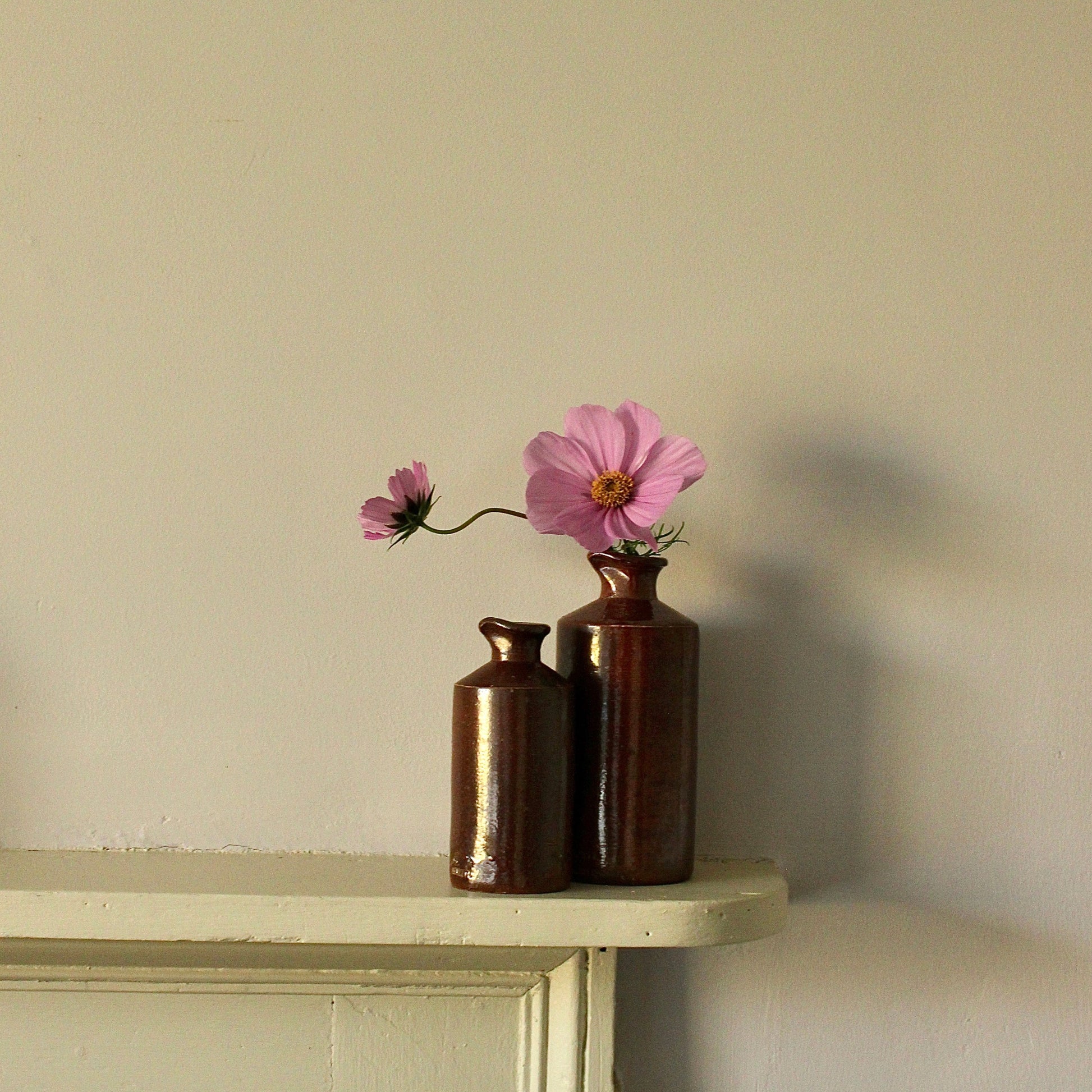 Handpicked from antique traders by our team for their beautiful burnished amber colours, these Victorian ceramic salt glazed ink bottles make a delicate statement whether as flower pots, pen holders, or brush pots.